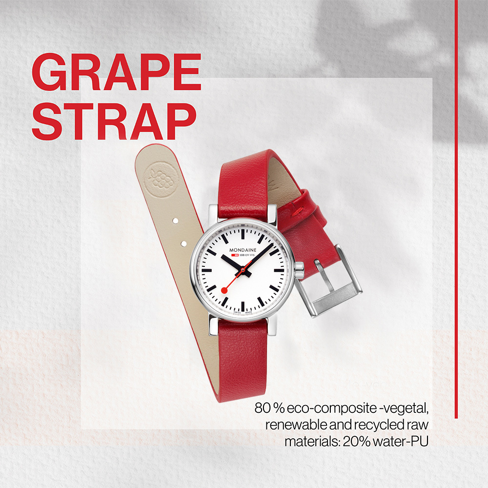 另一個全新的變革是我們將全面換上新研發的純素植物皮革錶帶(Vegan Grape Leather)。它以75%比例的植基材料(葡萄及蘋果)和25%的回收PET製成,經過嚴謹測試後發現,這款純素錶帶不論在柔軟度、耐用性、甚至是美觀程度上均與傳統的牛皮錶帶一樣優異,更不會引起任何皮膚過敏情形。