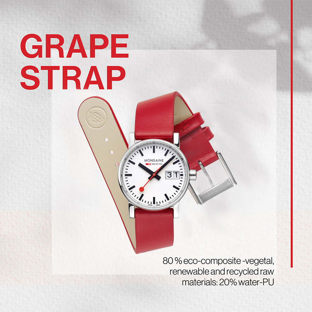 另一個全新的變革是我們將全面換上新研發的純素植物皮革錶帶(Vegan Grape Leather)。它以75%比例的植基材料(葡萄及蘋果)和25%的回收PET製成,經過嚴謹測試後發現,這款純素錶帶不論在柔軟度、耐用性、甚至是美觀程度上均與傳統的牛皮錶帶一樣優異,更不會引起任何皮膚過敏情形。