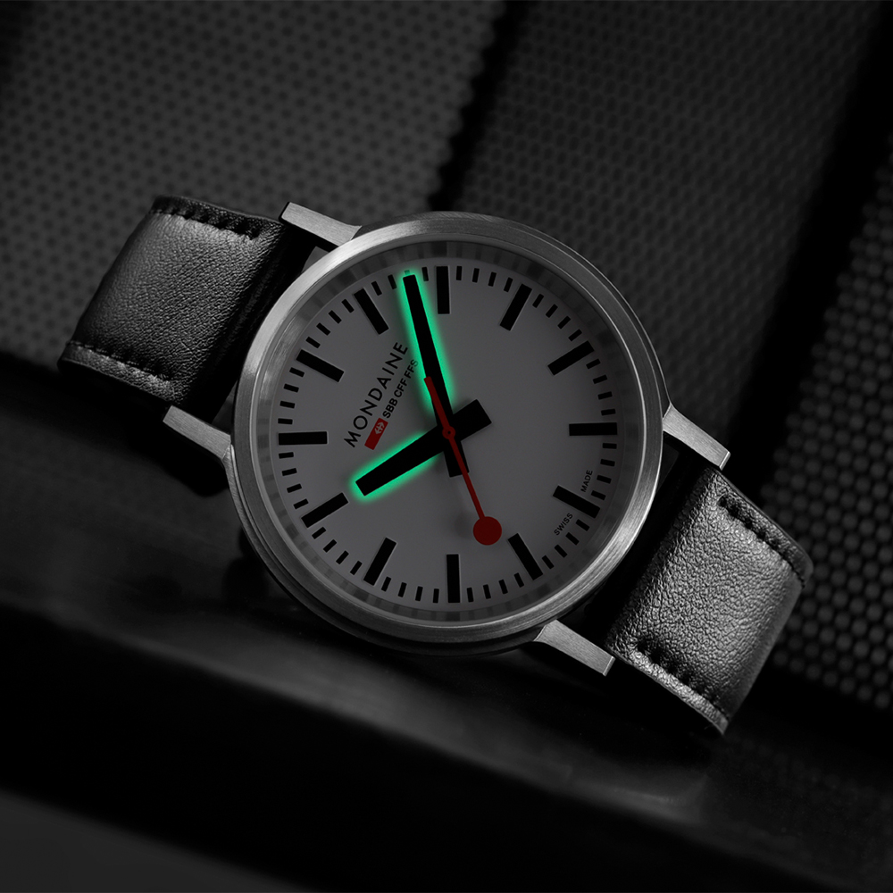 白色錶盤款式具備Backlight夜光指針- 這是 Mondaine 的註冊專利技術,它將SuperLuminova夜光塗料運用於時分指針的背面;而黑色錶盤款式則直接將SuperLuminova夜光塗料使用於指針上,這兩種設計都讓您能夠不分晝夜,清楚的辨別時間。