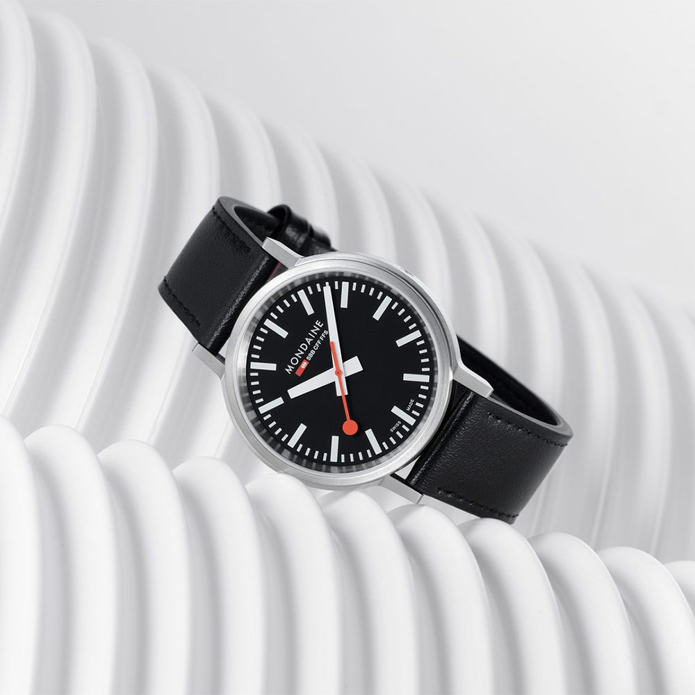 stop2go 系列不僅繼承了瑞士鐵路鐘的標誌性經典外觀設計,更搭載一枚獨特的機芯,能讓手錶展現與瑞士鐵路鐘相同的走法:紅色圓秒針以58 秒走完一圈,並在 12 點鐘等待 2 秒,與分針一起優雅地躍入下一分鐘。