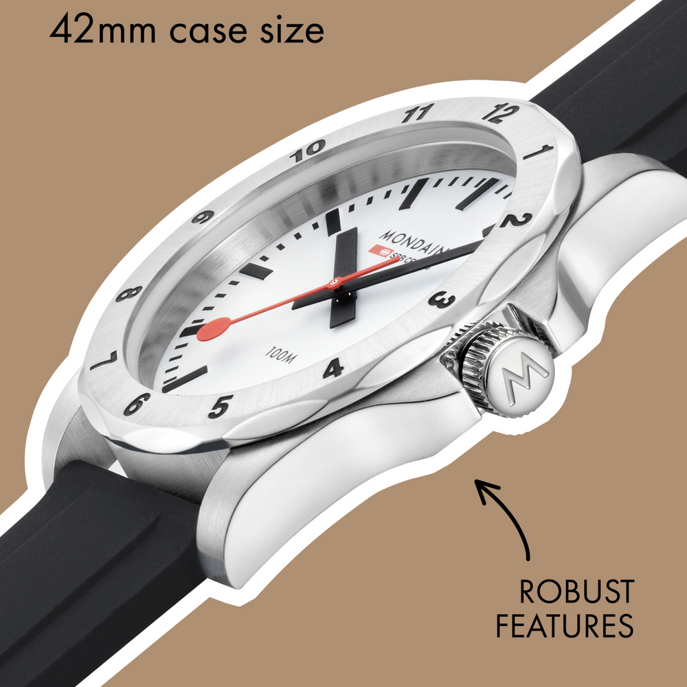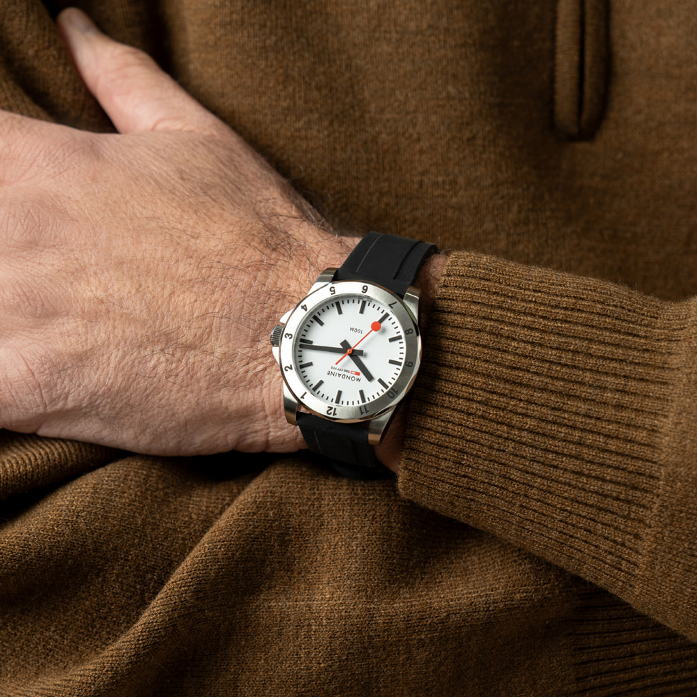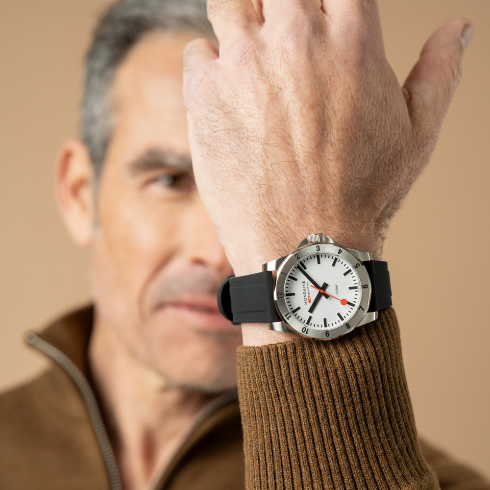 本款腕錶配備兩種不同風格的快拆錶帶選項:運動感十足的矽膠錶帶,印有 MONDAINE 經典「M」圖騰,或兼具光面與霧面質感的不鏽鋼鍊帶。手錶更具備10ATM(100米)防水效能,無論日常或戶外活動皆能安心佩戴。