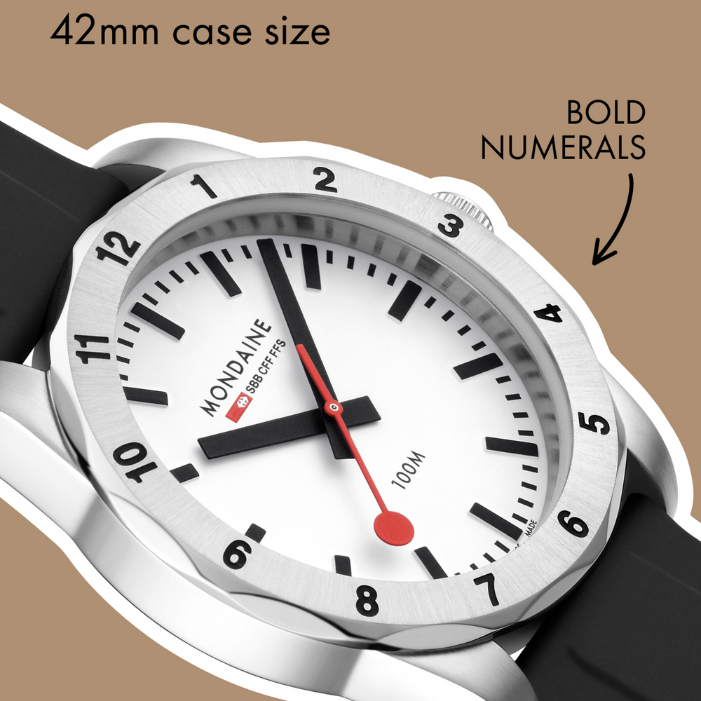 錶殼設計採取正面髮絲紋與側面拋光的兩種手法處理,兼具現代感與高級質感,適合日常與正式場合穿搭。面盤提供經典的黑、白兩種選擇,並分別搭配 MONDAINE 專利的BackLight(白面款)與 Super-LumiNova®(黑面款)夜光技術,前者將夜光塗料施於指針背面,後者則塗佈於正面,確保不同光線下均能清晰判讀時間。