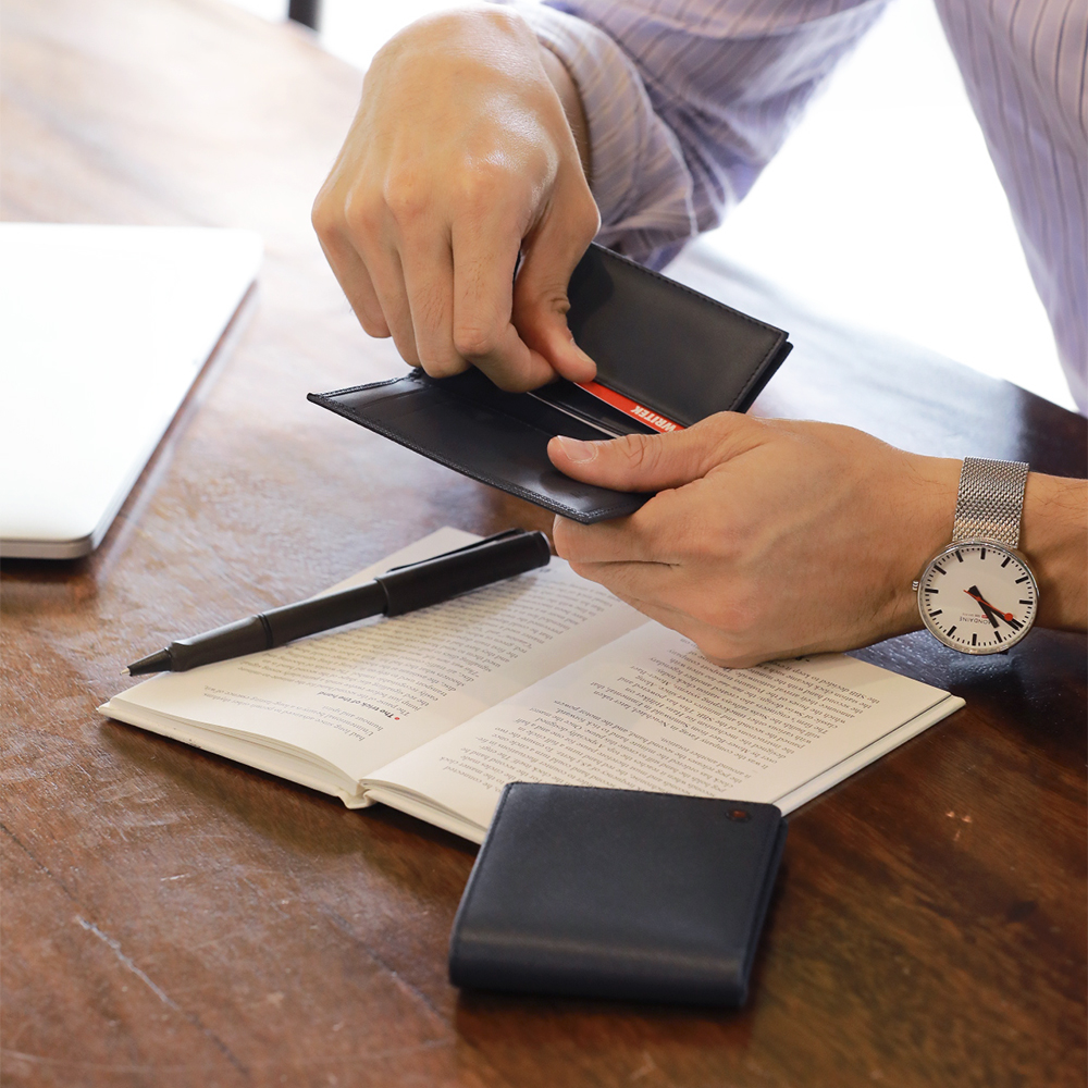 名片夾內部設置有3個卡片夾層、以及1個加厚型名片口袋,讓您能放置更多名片或卡片。背面另設置有1個卡片夾層,可隨手收納常用的卡片或交通卡;功能性強,分類收納方便,展現一貫瑞士實用設計主義。