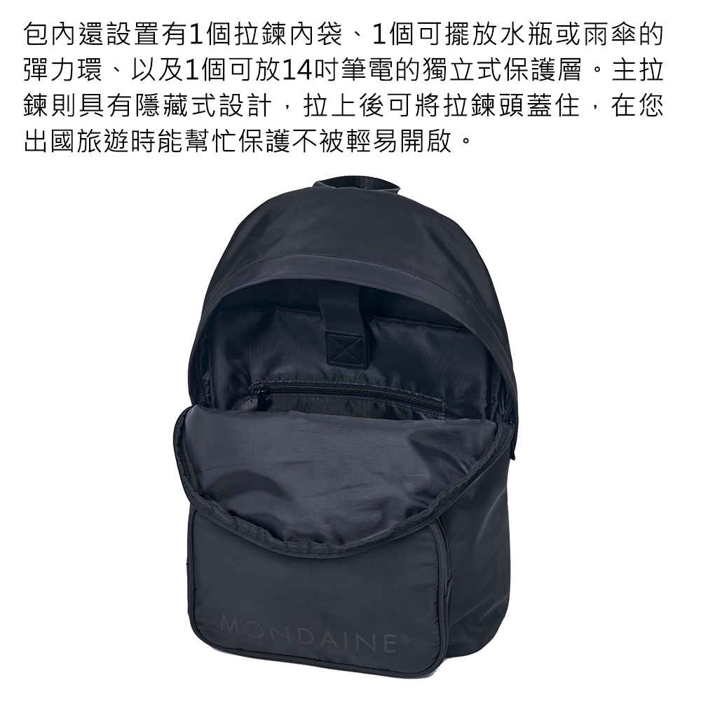 此外,包內還設置有1個拉鍊內袋、1個可擺放水瓶或雨傘的彈力環、以及1個可擺放14吋筆電的獨立式保護層。包包主拉鍊則具有隱藏式設計,拉上後可將拉鍊頭蓋住,在您出國旅遊時能幫忙保護包包,不易被小偷得手。