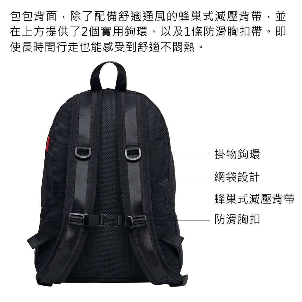 而在包包背面,除了配備舒適通風的蜂巢式減壓背帶,並在上方提供了2個實用鉤環、以及1條防滑胸扣帶。這些小細節能幫助減輕您背上的負擔,即使長時間行走也能感受到舒適不悶熱。還設置有一個側開口,讓您臨時需要騰出隻手時,不論是傘、水瓶、還是手機,都可迅速暫放入背網內。