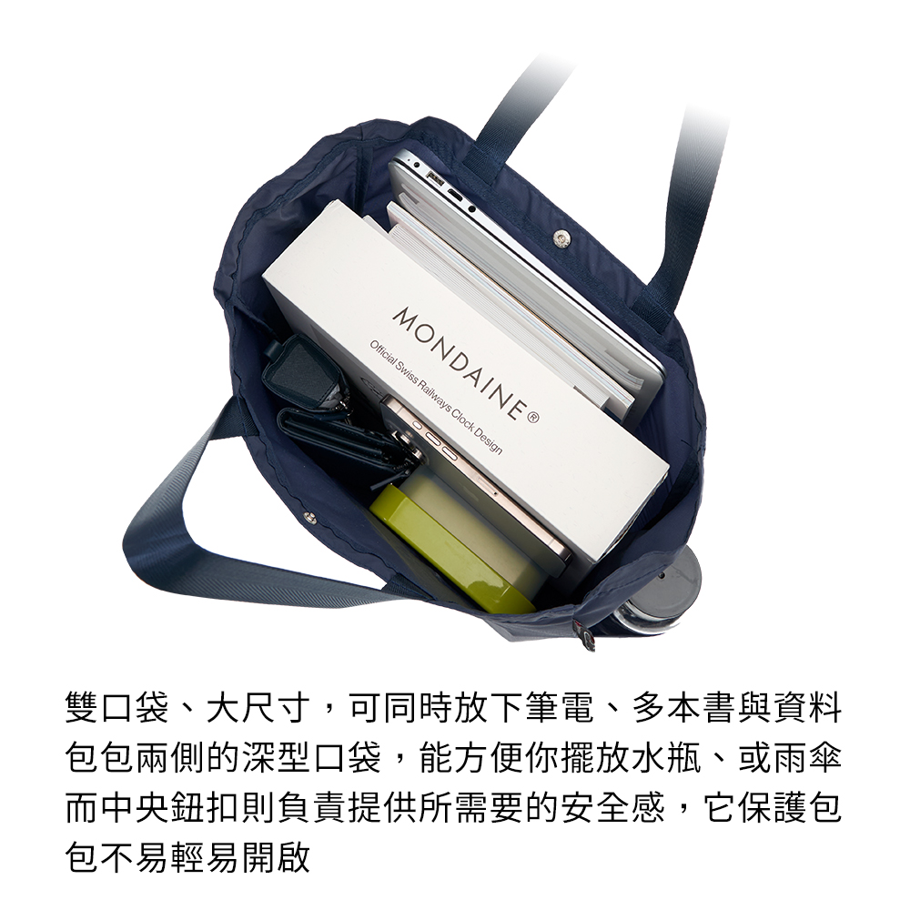包包兩側的深型口袋,能方便你擺放水瓶、或雨傘。而中央鈕扣則負責提供所需要的安全感,它保護包包不易輕易開啟。