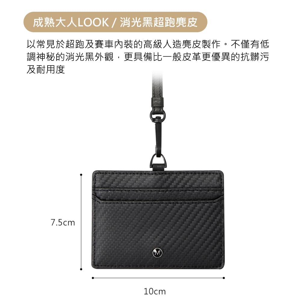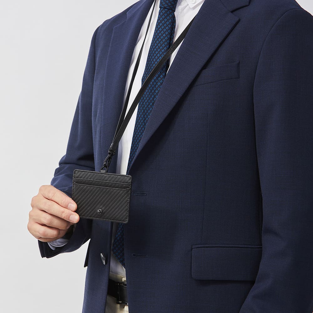 碳纖維紋理象徵 高科技與極致工藝,不僅帶來出色的視覺層次感,也能有效減少刮痕,長時間使用依然維持精緻外觀。這款證件套適合追求簡約、專業風格的商務人士,無論是正式會議、通勤,或是各類展會場合,都能展現出穩重自信的風範。