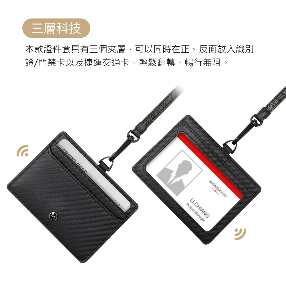 考量使用便利性,證件套內部設有 雙卡卡槽,可同時收納 識別證、門禁卡、信用卡或交通卡,避免卡片遺失或雜亂,讓您隨時保持整潔有序,提升工作效率。