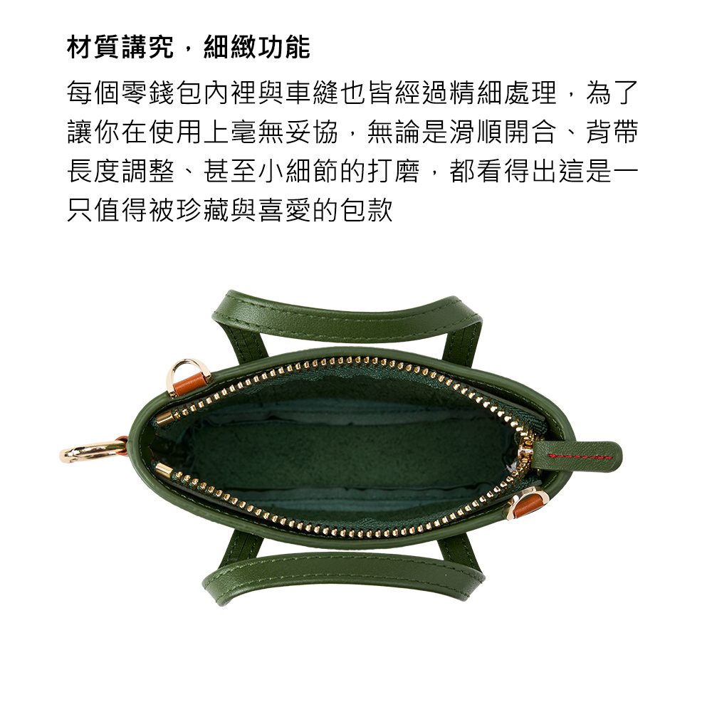 每只零錢包從內裡布料、車縫線到金屬細節皆經過精細處理。開合滑順、背帶調整順手,細節打磨講究,讓這款小包在外型與使用體驗上都無可挑剔。